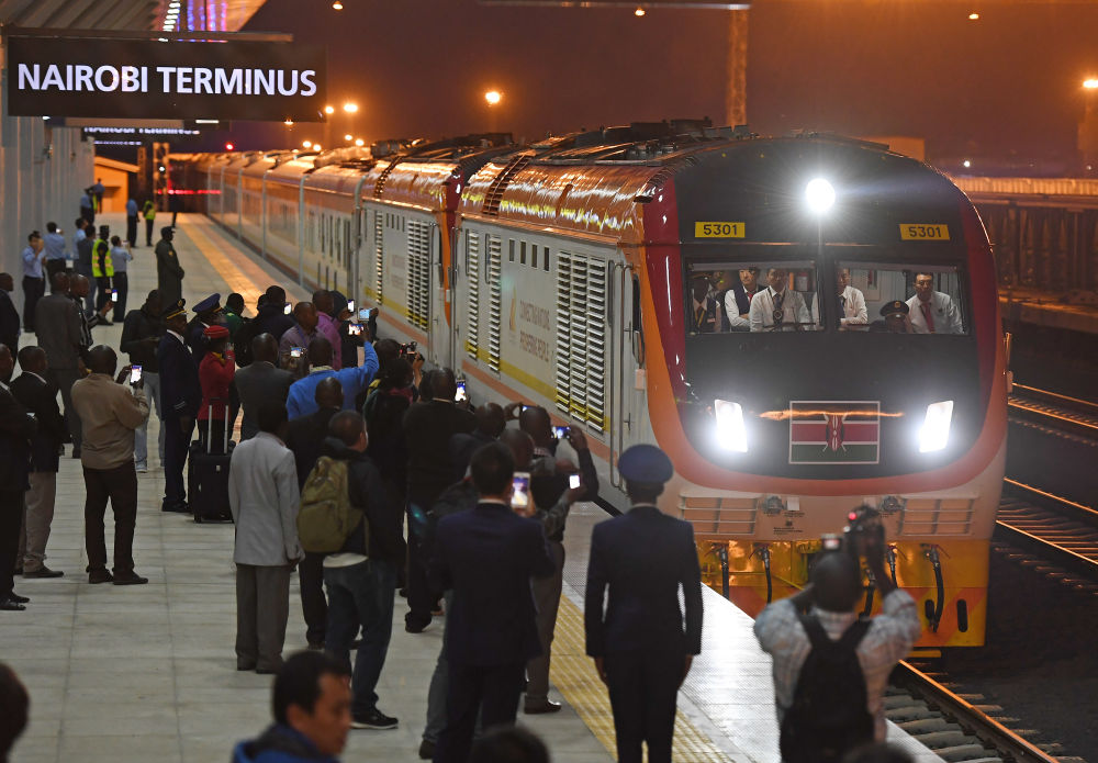 这是在肯尼亚首都内罗毕,首班从蒙巴萨发出的列车到达蒙内铁路内罗毕南站(2017年5月31日摄)。由中国企业承建的蒙内铁路当日建成通车。五年来蒙内铁路累计发送旅客778.5万人次,单日旅客最高发送量突破10000人。新华社记者 陈诚 摄