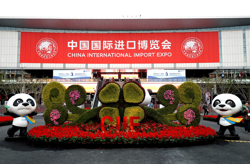 在国家会展中心(上海)场馆外,进博会吉祥物“进宝”准备迎接四方宾客(2018年11月4日摄)。新华社记者 陈飞 摄