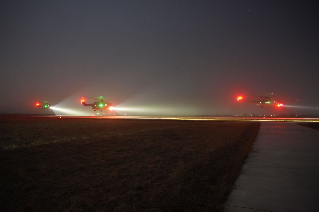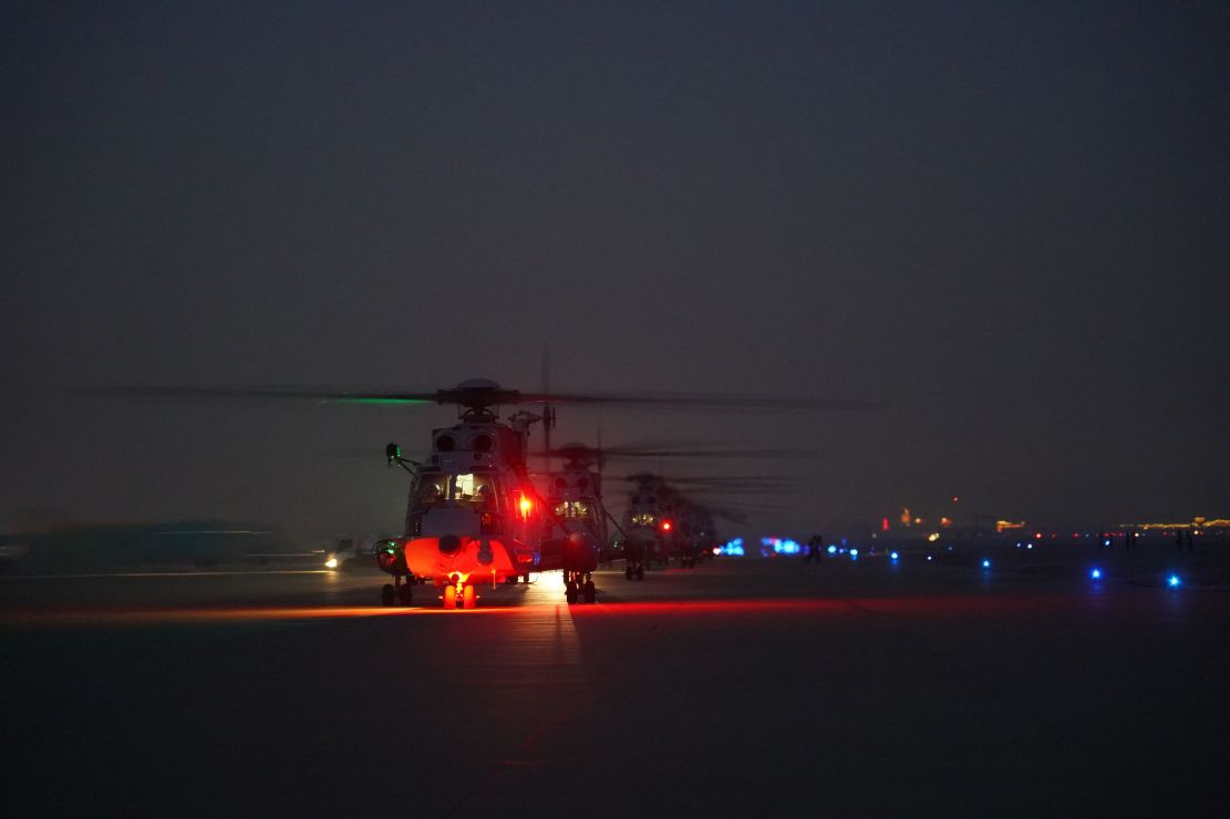 夜间飞行难度更高、风险更大,低能见度天气进一步增大训练难度。参训人员严肃认真、精神饱满,机务准备、夜航简令、进场接机,每一步都严谨细致、规范有序。随着夜航指挥员一声令下,数架直升机开车待飞,悬停增速、依次起飞,旋翼飞速旋转破空鸣响。