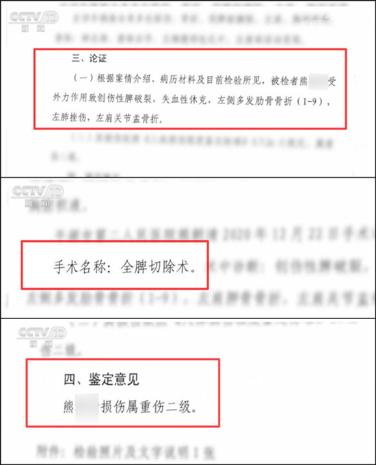 但事实上,这起事故远比向某想得严重。电动车驾驶人熊某创伤性脾破裂、失血性休克、左侧多发肋骨骨折(1-9)、左肺挫伤、左肩胛骨骨折、左肩关节盂骨折,并最终切除了破裂脾脏。经鉴定,熊某所受损伤属重伤二级。