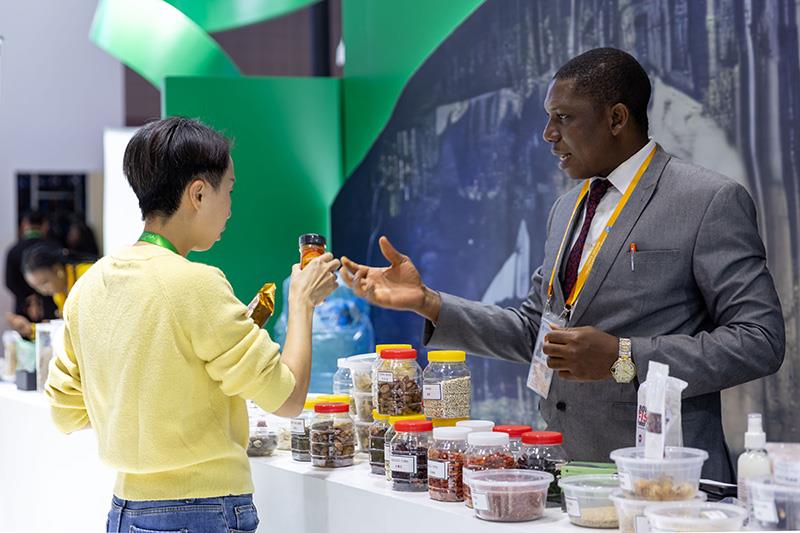△2023年11月7日,在进博会国家馆尼日利亚馆,展商介绍尼日利亚产品。