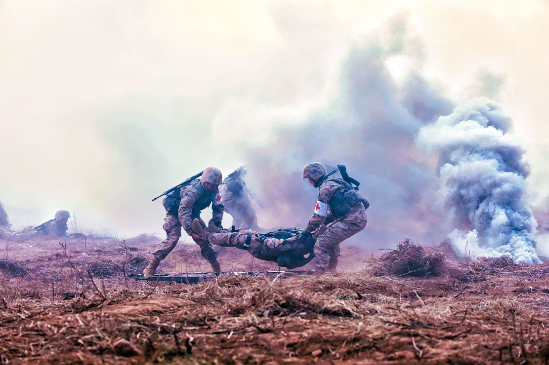 前沿阵地上,炮火连天,硝烟弥漫。左翼主攻连抢占要点时,突遭“敌”集火打击,5名战士“受伤”倒地。“火力压制,烟雾掩护,抢救组前出搜救转移伤员!”连长及时调整部署,抢救组闻令前出,利用拖拽带和担架将“伤员”转移至集伤点进行自救互救,无法处置的“伤员”则依托野战急救车紧急送往营救护站进行诊疗。