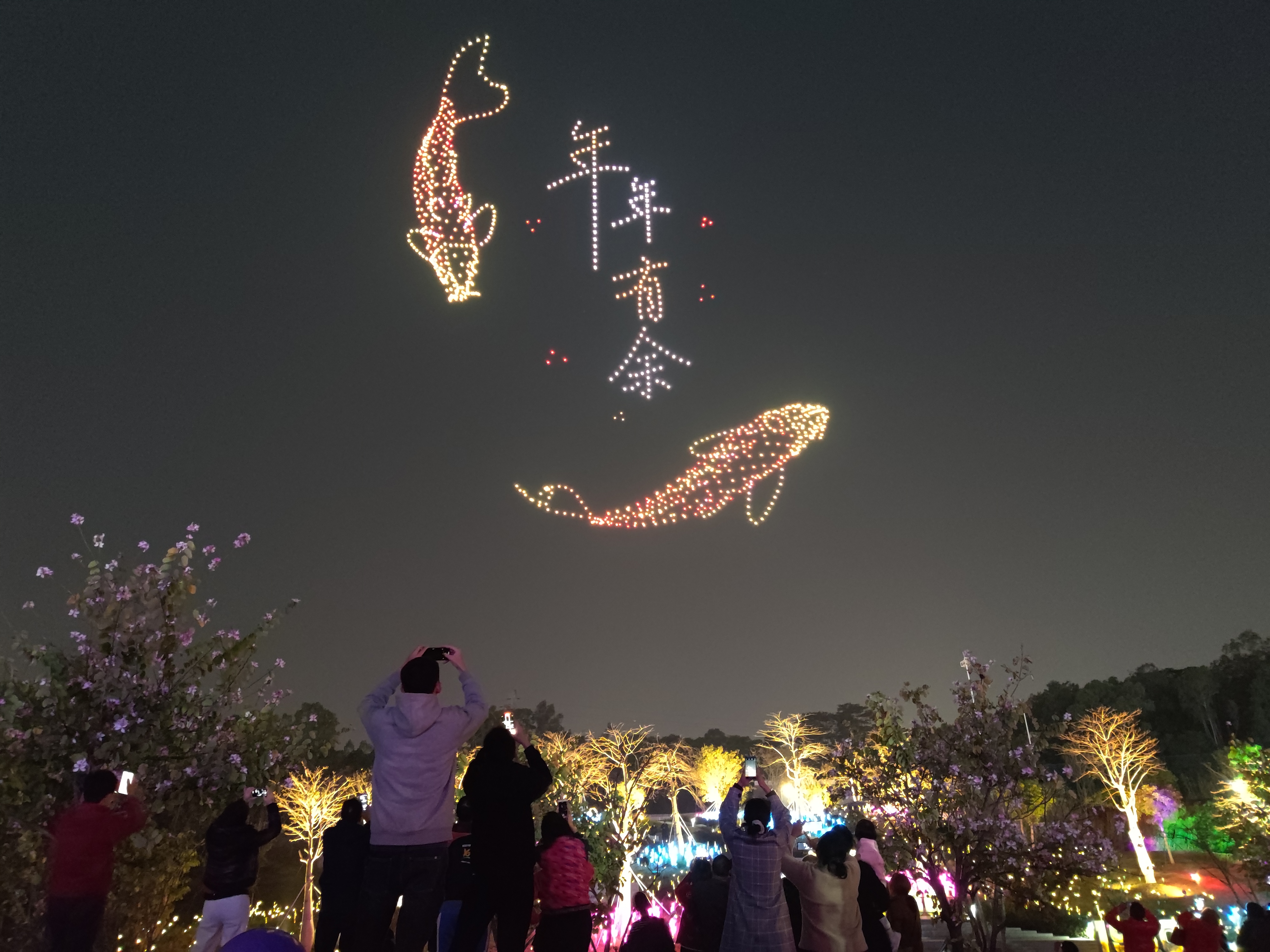 △ 2024年2月10日,深圳北站中心公园,春节主题无人机灯光秀引来众多游客驻足观看。